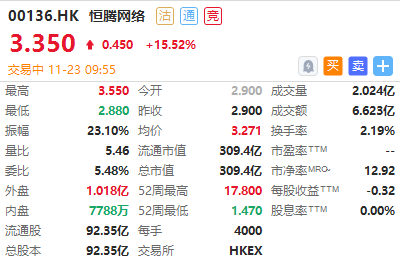 华盛资讯11月23日消息,11月18日,中国恒大一纸公告,彻底清仓了恒腾网络,公司股价连续四日暴涨,今日再度涨超15%,四日涨幅超100%。