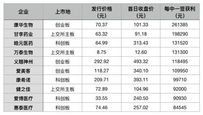 而好光景明明去年还在。2020年医疗企业的上市首日出现的另一番热闹景象:在2020年中一签医药股,平均获利至少4万元,而今年这个数字是2.5万元;去年诞生了获利超过10万元的四只医药股(康华生物、甘李药业、万泰生物、爱美客),其中康华生物中一签后甚至能赚26万元,而今年只出现了两家(皓元医药、义翘神州)。