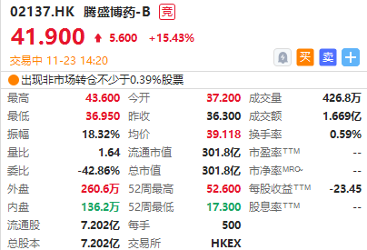 华盛资讯11月23日消息,腾盛博药(02137)盘中短线急升,最新报41.9港元,涨15.43%,成交额1.669亿港元。