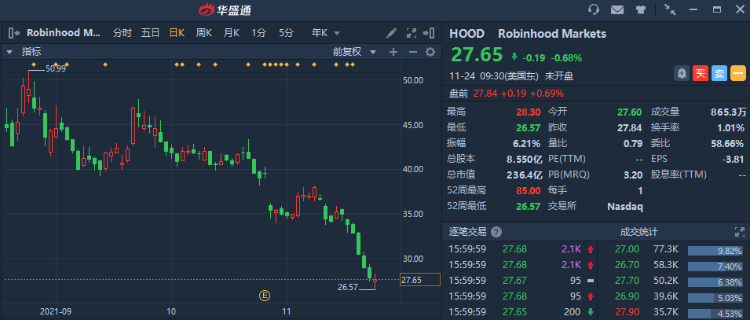 从7月29日在纳斯达克上市以来,Robinhood的股价就一直处于下滑通道中,不仅持续走低,而且丝毫没有复甦的迹象。目前,该股的股价距离8月份创下的84美元纪录高点下跌了约65%,上周该股累计下滑了17.67%以后,周一再次下跌3.97%。没有最低,只有更低,Robinhood的股价已经连续五个交易日跌至历史低位,11月8日以来,该股的股价就一直低于7月IPO价格的38美元。