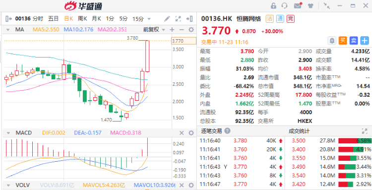恒腾网络持续上涨,目前涨30%,报3.77港元,最新总市值348.1亿港元,该股5个交易日涨超130%。