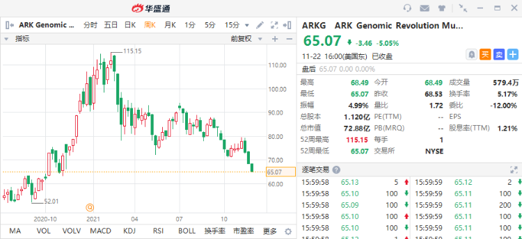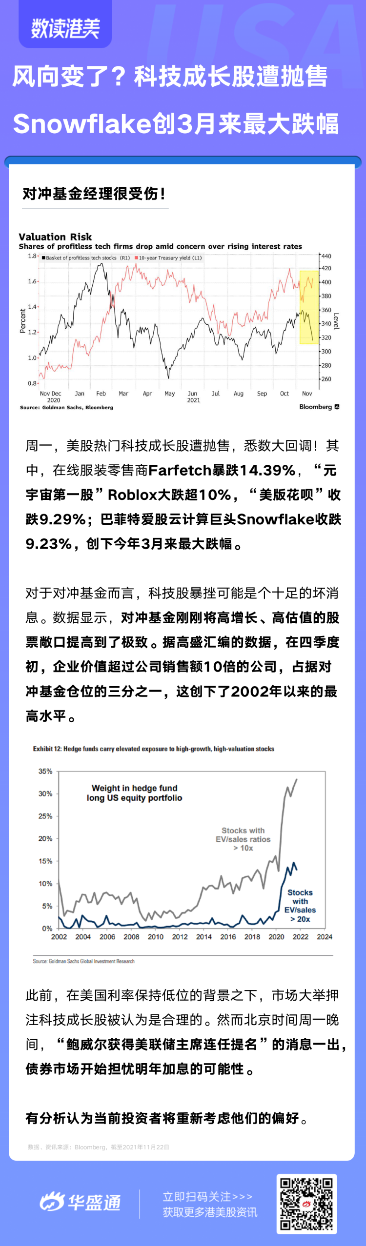 除了对冲基金外,另一位成长股爱好者木头姐,或许也在科技股抛售中“受伤”。方舟旗舰基金ARKK $ARKK 本周一收跌超4%,本月以来累计跌幅达10.55%;木头姐旗下另一只基金ARKG $ARKG 周一下跌5.05%,跌至一年来的低点,今年以来累计跌幅已达30%。