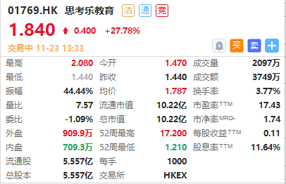 华盛资讯11月23日消息,教育股集体爆发,思考乐教育午后暴涨28%,新东方在线涨9%,卓越集团、枫叶教育涨8%,天立教育、新高教集团涨6%。