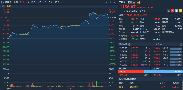 最近连续五天的上涨令特斯拉市值增加了逾1750亿美元,使其股价又回到历史高点附近。周一其股价盘中一度突破1200美元,距离此前最高点1243.49美元可谓一步之遥。短短的五天内大涨约17%,而这主要与一则传言有关——特斯拉将进行拆股。