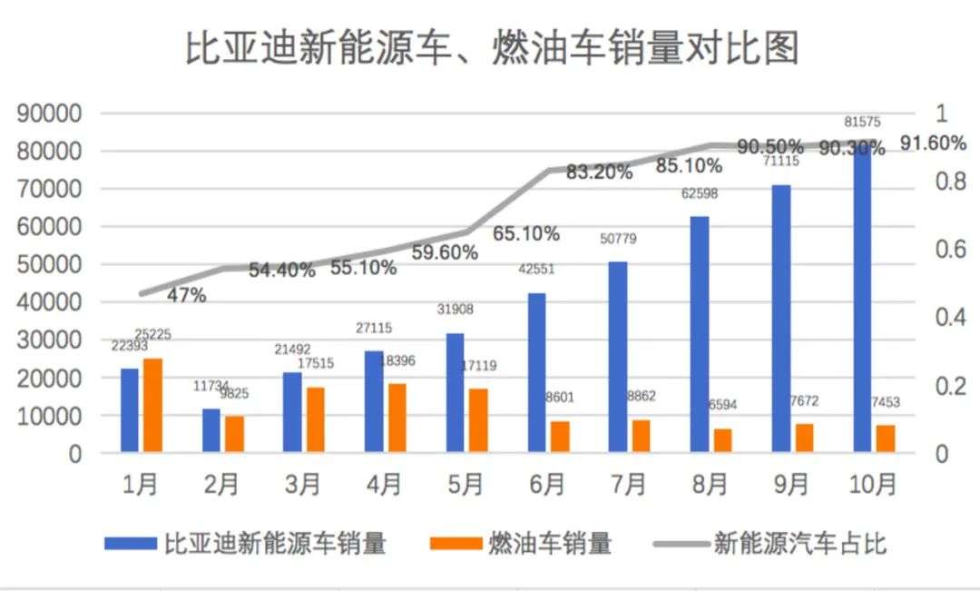 2021年1-10月,比亚迪新能源汽车销量占比从年初的47%,一路攀升,9月和10月都稳定在90%以上。