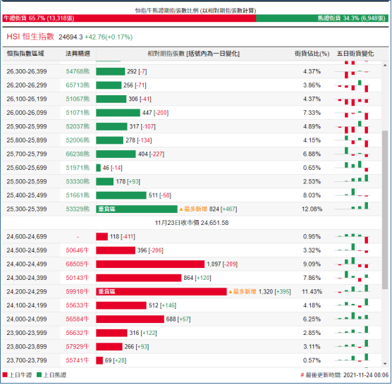 街货分布方面,至周二,恒指牛证街货在收回价24200点至24700点之间,累计相当约3795张期指合约;恒指熊证街货在收回价25300点至25800点之间,累计相当约1963张期指合约。