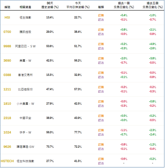 周二恒指相关权证的平均引伸波幅报约22.7%,按日微幅上升。个股方面,美团相关认购证的引申波幅上调2%。