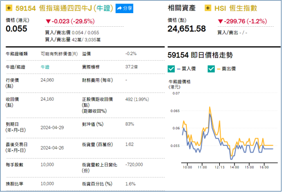 2、看错方向:恒指瑞通四四牛(59154.HK),周二下跌29.5%。