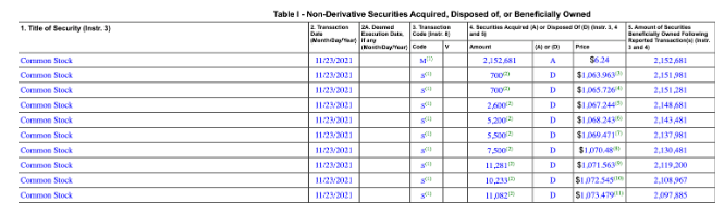 文件显示,马斯克在11月23日总计通过105笔交易出售了934,091股股票,加权平均售价介于1063.963美元至1179.083美元之间。这些股票将于2022年8月13日到期。
