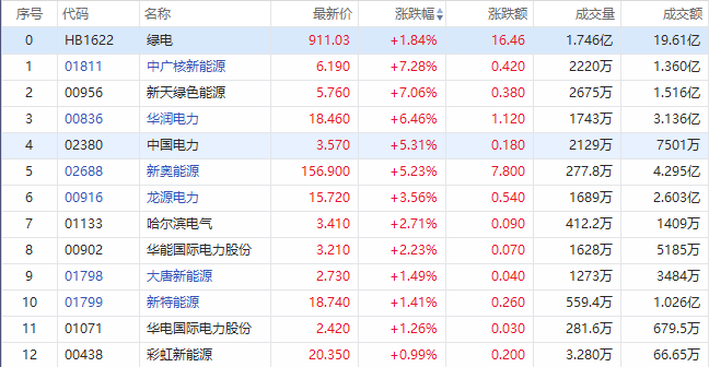 华盛资讯11月24日消息,港股绿电概念股再度走强,中广核新能源、新天绿色能源涨超7%,华润电力涨超6%,中国电力、新奥能源涨逾5%,龙源电力涨超3%。