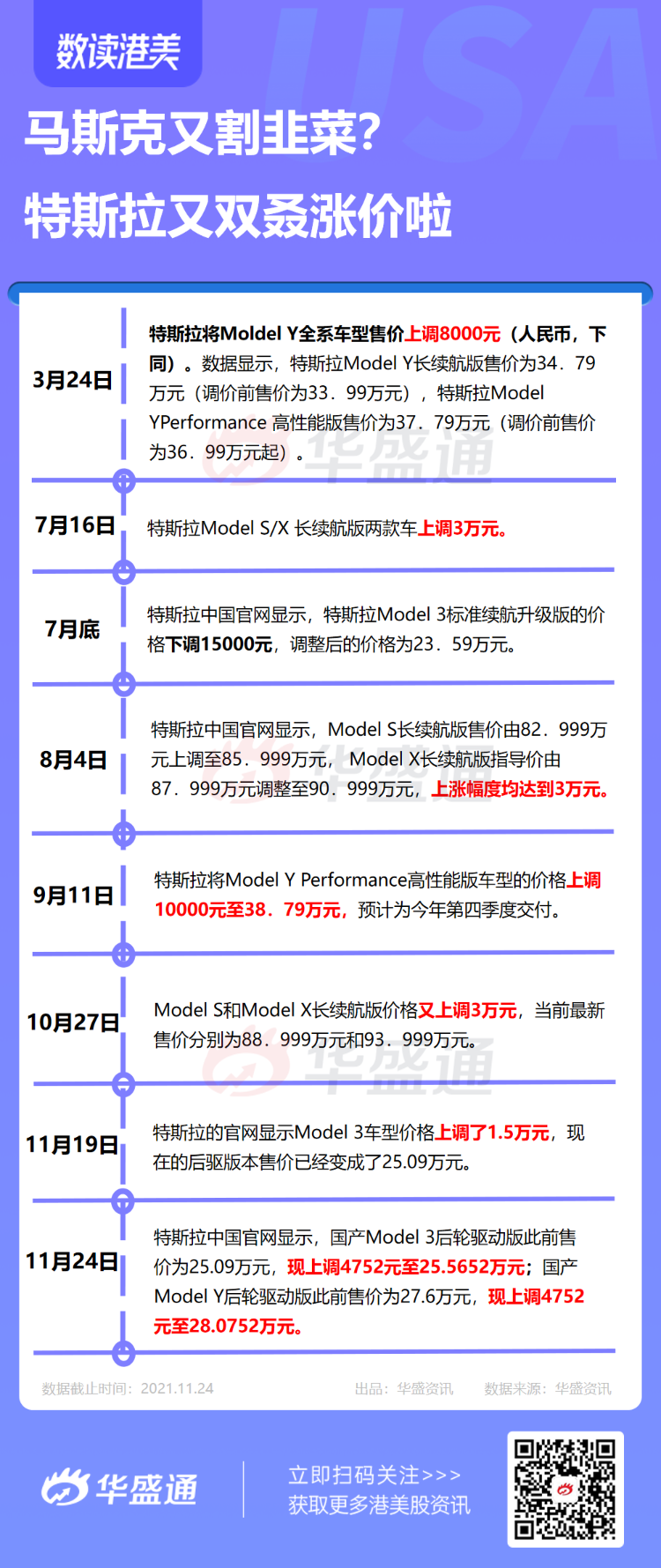 据华盛资讯不完全数据统计,这已经是特斯拉2021年以来在中国的第7次涨价,具体调价日程如下:
