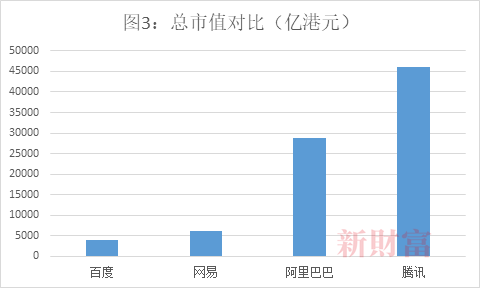 虽然网易云音乐上市进入倒计时,但截至11月23日收市,网易股价下跌2.28%,其总市值为6226亿港元,超过百度(09888.HK)的4026亿港元。另外,阿里巴巴市值28844亿港元,而腾讯总市值46172亿港元,网易、百度、阿里巴巴市值总和(39096亿港元),依旧难敌腾讯(图3)。