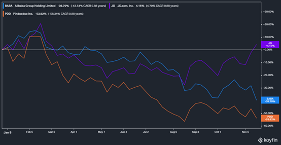 阿里巴巴今年迄今股价下跌42.57%,与京东 $JD 4.15%的涨幅形成鲜明对比。然而阿里目前还不是电商中的垫底生,拼多多 $PDD 股价今年以来已经下跌55.38 %,市值从最高点的2607亿美元腰斩至993.3亿美元。