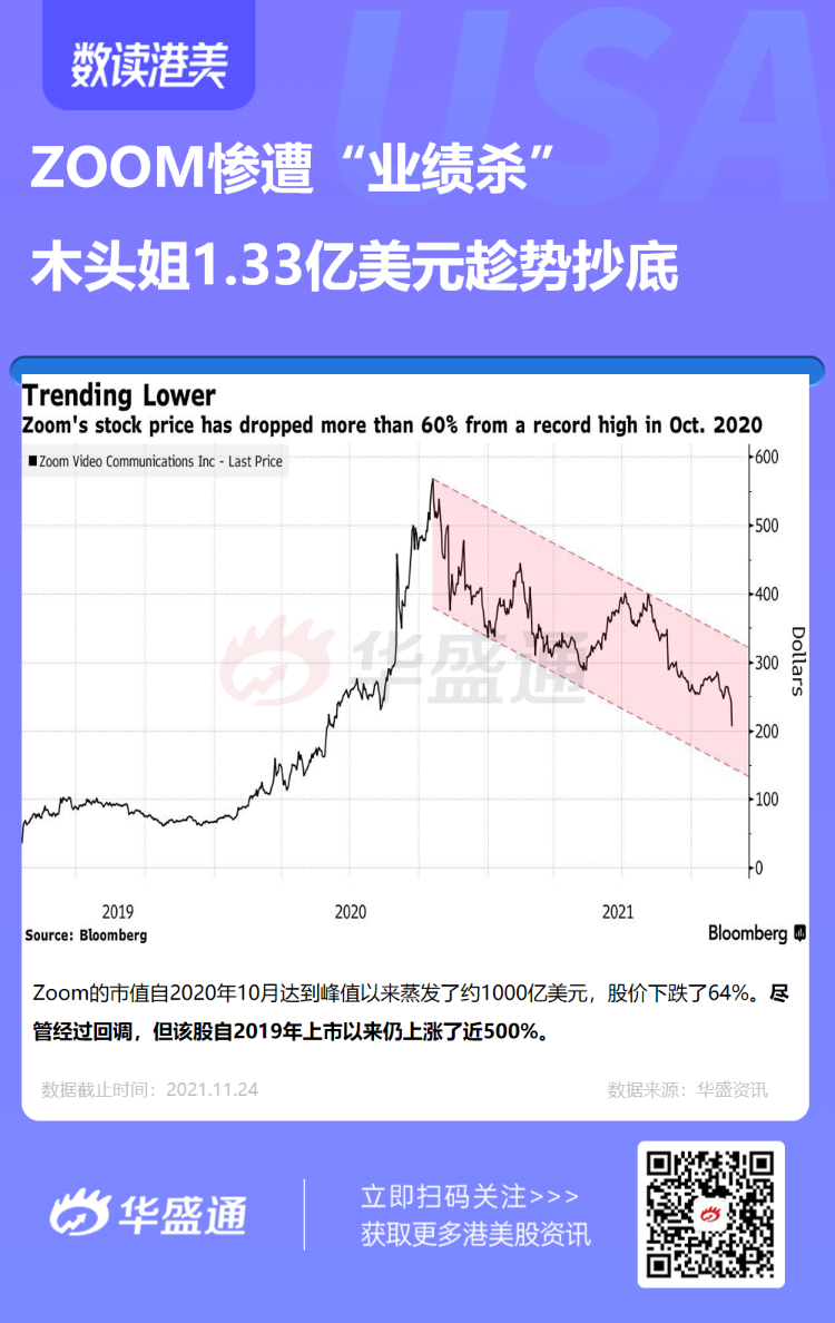 此外,Zoom的市值自2020年10月达到峰值以来蒸发了约1000亿美元,股价下跌了64%。尽管经过回调,但该股自2019年上市以来仍上涨了近500%。