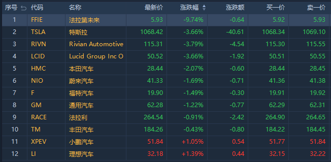 截至发稿,法拉第未来跌9.74%,特斯拉跌3.66%,Rivian跌3.79%,Lucid跌3.66%,蔚来汽车跌1.69%,理想汽车涨1.39%,小鹏汽车涨1.05%。