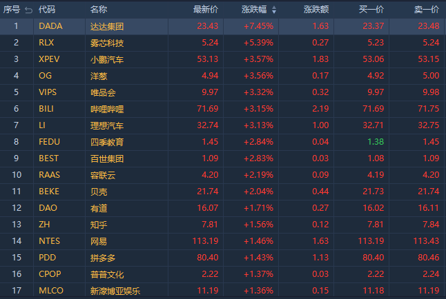 截至发稿,达达集团 $DADA 涨7.45%,雾芯科技 $RLX 涨5.39%,小鹏汽车 $XPEV 、洋葱 $OG 、唯品会 $VIPS 、哔哩哔哩 $BILI 、理想汽车 $LI 均涨超3%,贝壳 $BEKE 涨超2%,有道 $DAO 、知乎 $ZH 、网易 $NTES 、拼多多 $PDD 涨超1%。