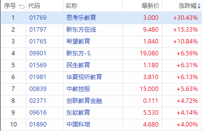 华盛资讯11月25日消息,港股教育股盘中持续走高,截至发稿,思考乐教育涨超30%,该股已连续三日大涨,股价三日翻倍;新东方在线涨超15%;希望教育涨超10%;新东方-S、民生教育涨超6%;中教控股涨超5%;东软教育涨超4%。