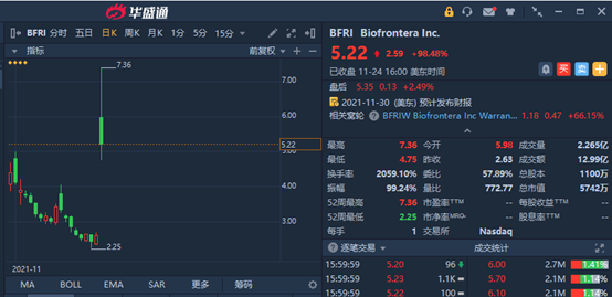 周三美股收盘,皮肤科生物制药公司Biofrontera $BFRI 的股价涨近98%,该股盘中一度上涨150%,收盘价为5.22美元,创下历史新高,现最新成交额为12.99亿美元。