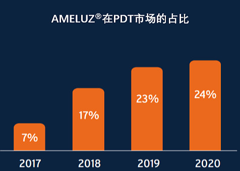 其产品包括两种处方药Ameluz和Xepi;以及与Ameluz一起使用的BF-RhodoLED灯为依托的光动力疗法(“PDT”),用于面部和头皮轻至中度光化性角化病的病变定向和野外定向治疗。该项疗法于2016年通过了美国FDA的审批。如下图所示,Ameluz®在PDT市场的占比逐年提升。