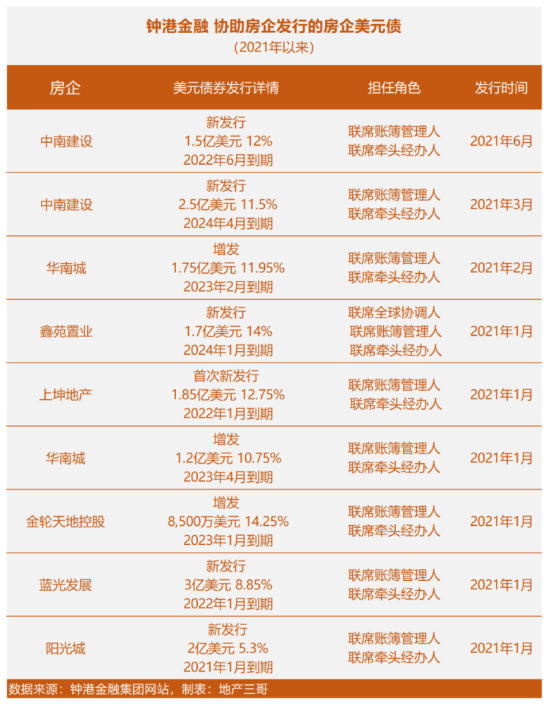 今年之前,钟港资本还是奥园、大发地产、鸿坤地产、正商地产、融信集团、金辉地产、朗诗绿色地产等房地产企业发行境外债券的联席账簿管理人和联席牵头经办人或及联席全球协调人。