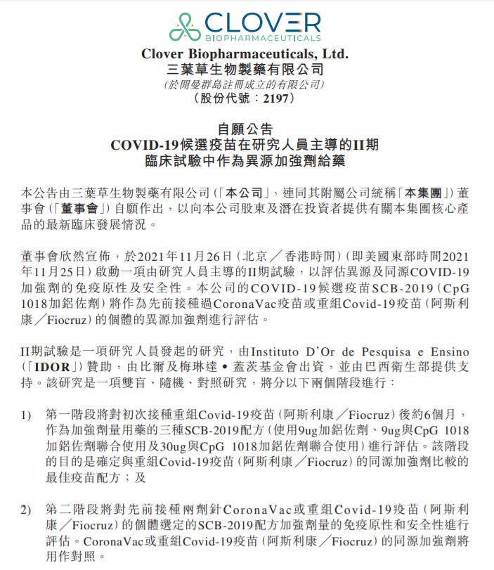 三叶草生物在港公告,候选新冠疫苗启动二期试验。公告称,公司于11月26日启动一项由研究人员主导的II期试验,以评估异源及同源新冠肺炎疫苗加强剂的免疫原性及安全性。