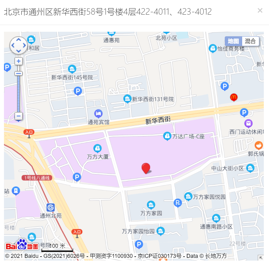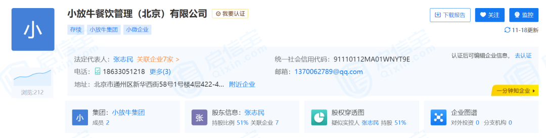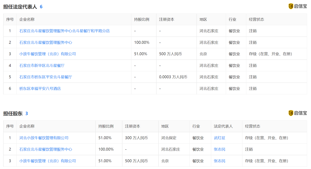 而启信宝显示,小放牛餐饮管理(北京)有限公司地址为通州区新华西街58号1号楼4层。百度地图显示该地址正位于新华西街的万达广场。该公司法人为张志民,与河北小放牛餐饮管理有限公司第一大股东、董事长为同一人。