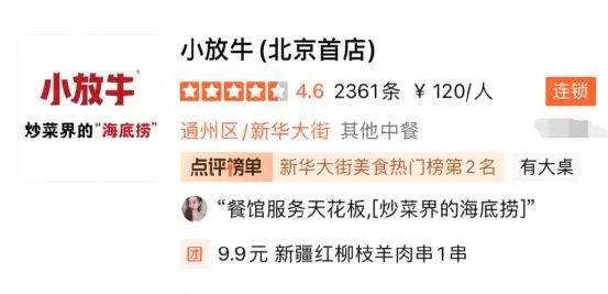 大众点评平台上,位于北京通州的小放牛位列“新华大街美食热门榜第2名”,店铺展示图片中不仅有“小放牛”名称,还有“炒菜界的海里捞”宣传语。