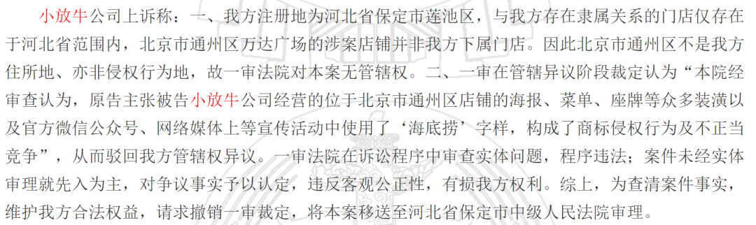 二、一审在管辖异议阶段裁定认为“本院经审查认为,原告主张被告小放牛公司经营的位于北京市通州区店铺的海报、菜单、座牌等众多装潢以及官方微信公众号、网络媒体上等宣传活动中使用了‘海底捞’字样,构成了商标侵权行为及不正当竞争”,从而驳回我方管辖权异议。一审法院在诉讼程序中审查实体问题,程序违法;案件未经实体审理就先入为主,对争议事实予以认定,违反客观公正性,有损我方权利。综上,为查清案件事实,维护我方合法权益,请求撤销一审裁定,将本案移送至河北省保定市中级人民法院审理。