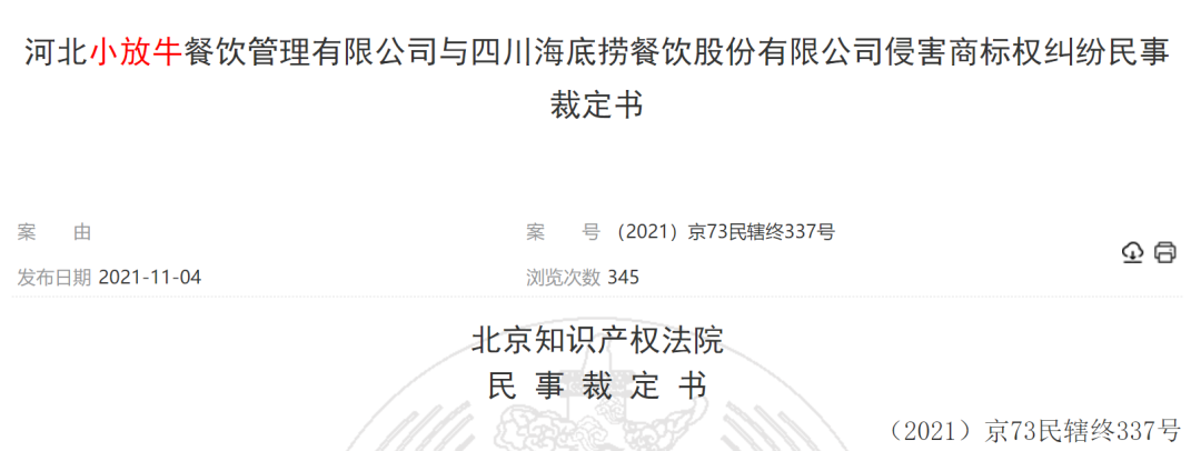 值得注意的是,据裁判文书网,今年10月21日,北京市知识产权法院就小放牛与海底捞侵害商标权纠纷一案出具了民事裁定书。