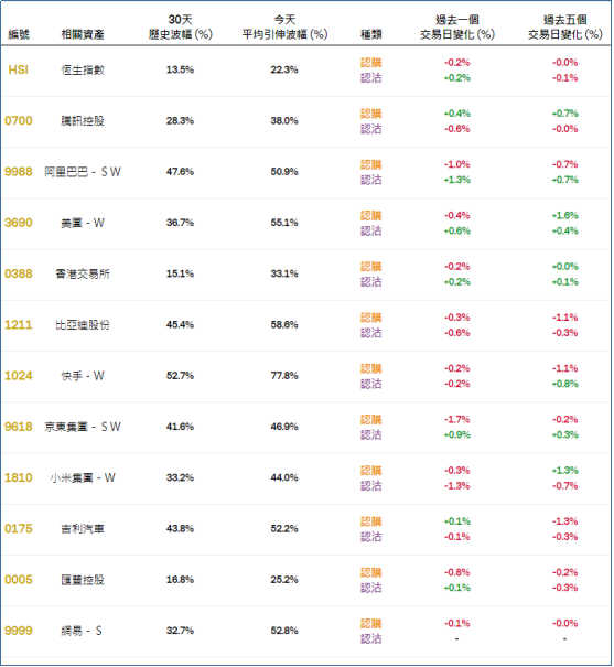 周四恒指相关权证的平均引伸波幅报约22.3%,按日继续微幅下调。个股方面,阿里、京东相关认购证的引申波幅下调1%。