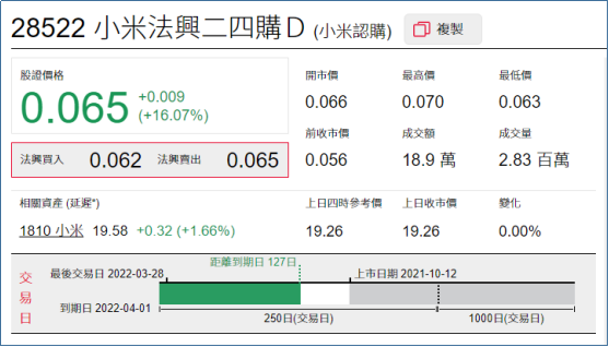 1、强势轮证:小米法兴二四购(28522.HK),周四上涨16.07%;
