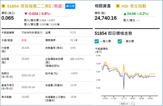 2、看错方向:恒指瑞通二二熊(51854.HK),周四下跌5.8%。