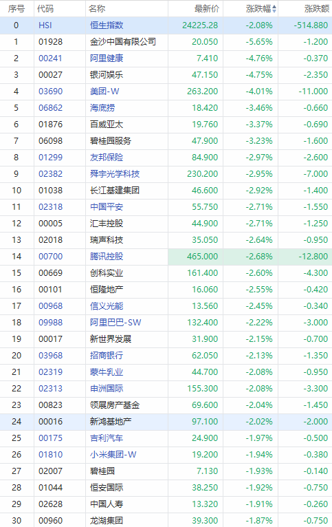 恒生指数跌幅扩大逾2%,成分股全体走跌,其中金沙中国跌超5%,阿里健康、银河娱乐、美团跌超4%,海底捞、百威亚太、碧桂园服务跌超3%。