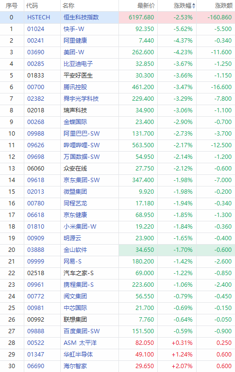 成分股中,海尔智家涨超2%,华虹半导体、ASM太平洋微涨;快手跌超5%,阿里健康、美团跌超4%,腾讯跌超3%,哔哩哔哩、阿里跌超2%,小米、京东跌超1%。