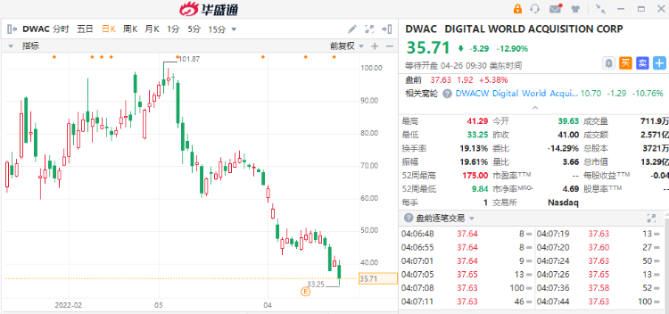 华盛资讯4月26日消息,今日美股盘前,Digital World Acquisition $DWAC 涨超5%,特朗普表示不会重返推特,将使用自建社交平台Truth Social。