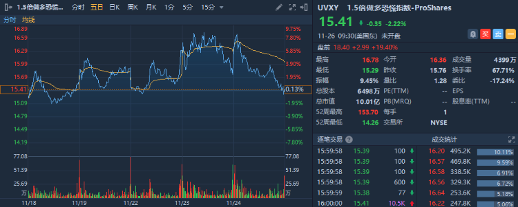 截至北京时间17:00,道指期货下跌2.00%,纳指期货跌0.93%,标普500指数期货跌1.63%,1.5倍做多恐慌指数ETF $UVXY 涨19.40%。