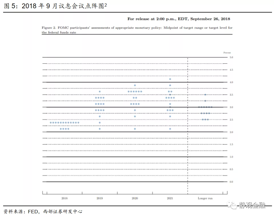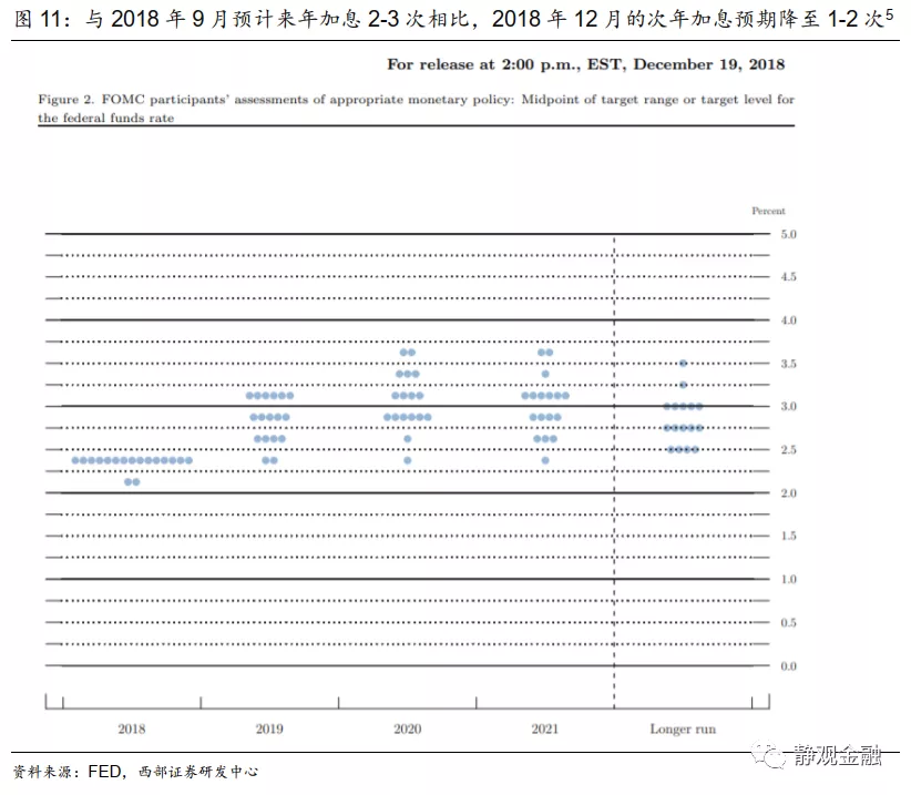 与2015年Q4情况类似,2018年Q4美国实际GDP环比折年率降至0.9%,创下三年新低。与此同时,美联储在2018年加息4次,且在原油价格大涨的助推下,2018年10月初10年期美债收益率攀升至3.23%,创下2011年5月后最高。不仅如此,2018年9月美联储议息会议点阵图暗示2019年仍有2-3次加息(图5),这使得油价回落后,10年期美债收益率又在11月8日升至3.24%。