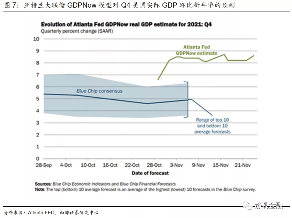 我们在10月31日报告《美国经济会衰退吗?》中指出,Delta病毒对疫情的影响降温、美国财政补贴结束推动就业意愿回升以及特效药问世等因素共振下,Q4美国经济将显著好于Q3。11月24日美国亚特兰大联储预计Q4美国实际GDP环比折年率为8.6%,远高于Q3的实际值为2.1%。