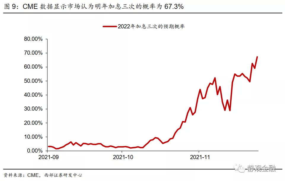 与经济下行担忧共存在是处于1930年以来次高水位的标普500指数10年席勒周期调整市盈率(图8)以及明年加息3次的市场预期(图9)。我们认为当前美股面临的经济放缓预期以及过于强烈的加息预期与2015年底及2018年底极为类似,由于估值过高,因此,未来1-2个月美股有可能出现超过15%的调整。