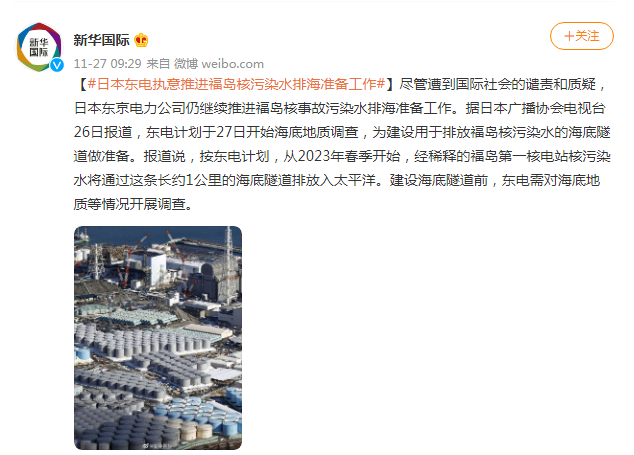 【#日本东电执意推进福岛核污染水排海准备工作#】尽管遭到国际社会的谴责和质疑,日本东京电力公司仍继续推进福岛核事故污染水排海准备工作。据日本广播协会电视台26日报道,东电计划于27日开始海底地质调查,为建设用于排放福岛核污染水的海底隧道做准备。报道说,按东电计划,从2023年春季开始,经稀释的福岛第一核电站核污染水将通过这条长约1公里的海底隧道排放入太平洋。建设海底隧道前,东电需对海底地质等情况开展调查。