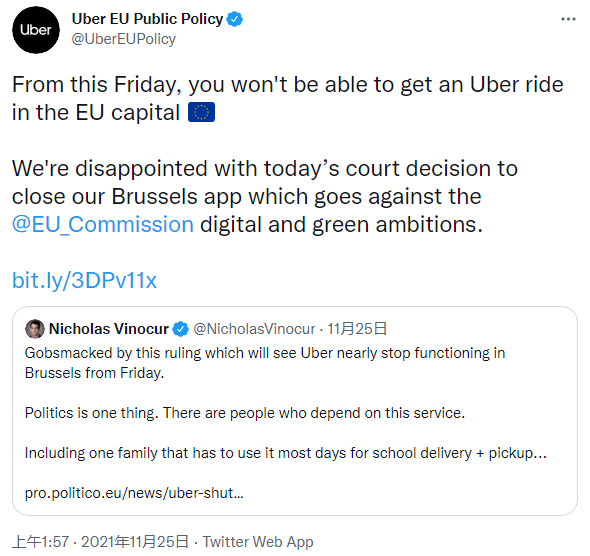 在周四的公告中,Uber 宣布将不再为布鲁塞尔地区的客户提供网约车服务。原因是早些时候,上诉法院裁定“禁止私人提供出租车服务的禁令,也适用于网约车平台的专职司机”。对于此事,Uber 认为这违背了欧盟委员会的数字与绿色倡议。毕竟 Uber 等企业的网约车服务,能够很好地满足广大客户“最后一英里”的通勤需求。