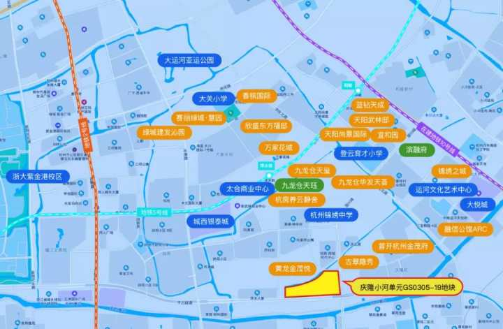 最核心区的一宗申花地块则是庆隆小河单元GS0305-19地块,位于隐秀路南,北面一路之隔即是黄龙金茂悦、古翠隐秀,东面紧邻登云路,南面是余杭塘路与余杭塘河。