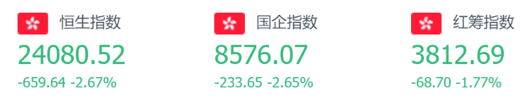 上周五恒生指数跌2.67%,报收24080.52,创逾一个半月新低;恒生科技指数跌3.25%,报收6151.99;国企指数跌2.65%,报收8576.07;红筹指数跌1.77%,报收3812.69。