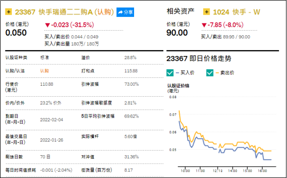 2、看错方向:快手瑞通二二购A(23367.HK),上周五下跌6.98%。