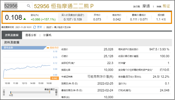 1、强势轮证:恒指摩通二二熊P(52956.HK),上周五上涨157.14%;