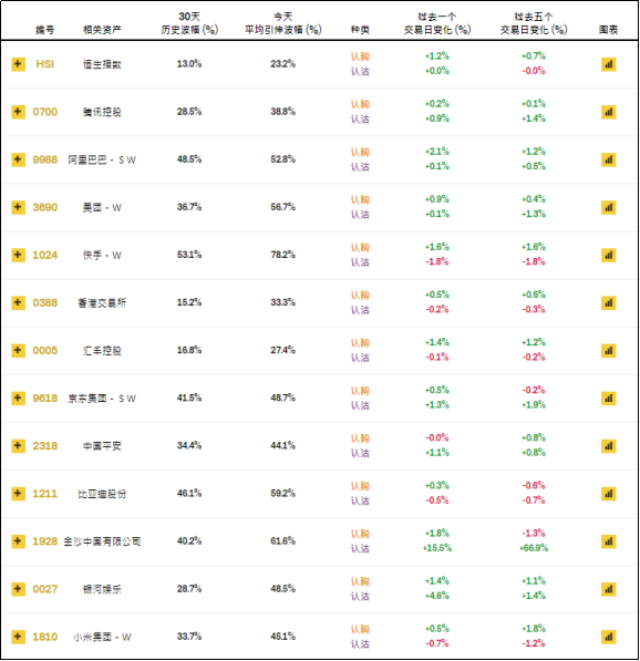 上周五恒指相关权证的平均引伸波幅报约23.2%。个股方面,阿里、快手相关认购证的引伸波幅按日调升显著;金沙相关认沽证的引伸波幅则按日调升15.5%。