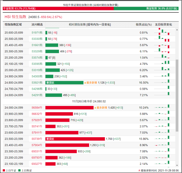 街货分布方面,上周五,恒指牛证街货贴价区间主要在收回价23600点至24100点之间,累计相当约4238张期指合约;恒指熊证街货在收回价24600点至25100点,累计相当约2317张期指合约。