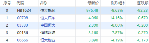 华盛资讯11月29日消息,“恒大系”集体走低,恒大汽车跌超14%,中国恒大跌8%,恒大物业跌超4%。