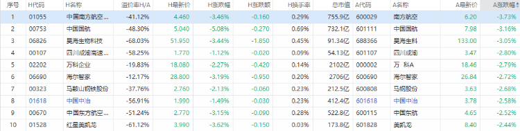 南方航空A股跌3.73%,H股跌3.46%;万科企业A股跌2.79%,H股涨2.27%。