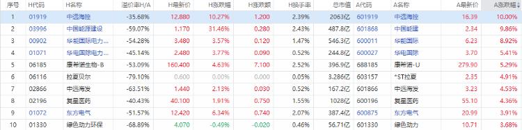 截至发稿,中远海控A股涨停,H股涨10.27%;中国能源建设A股涨9.86%,H股涨31.46%;华能国际A股涨8.92%,H股涨3.57%。